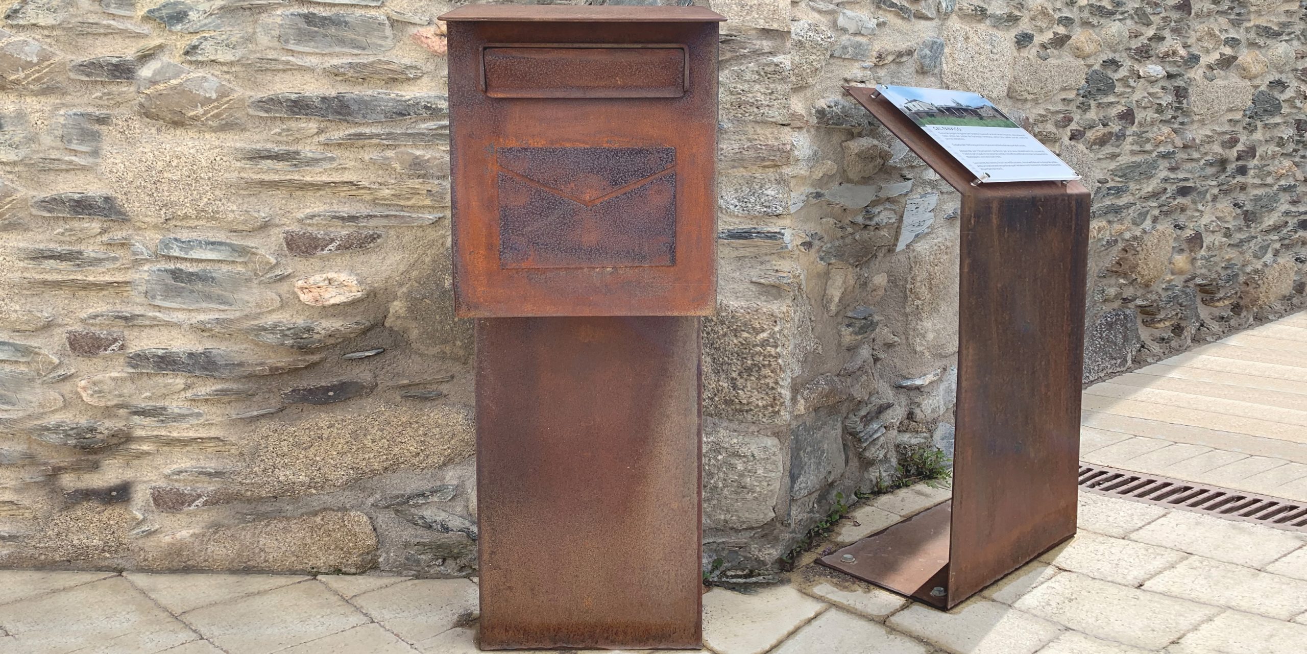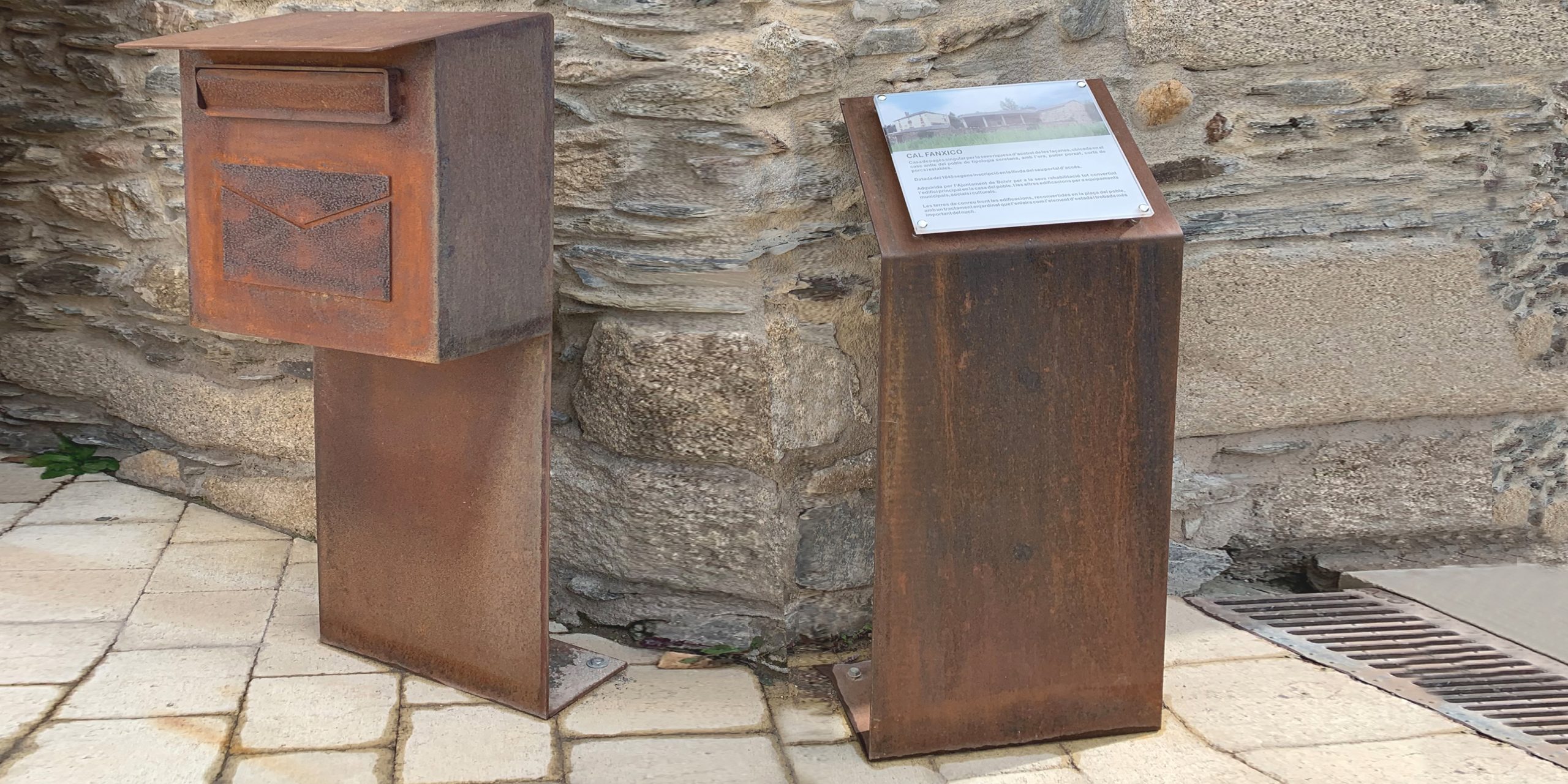 Para el nuevo recinto del Ayuntamiento y servicios locales se erige este nuevo elemento tanto de información como de buzón adaptado a las necesidades de la Administración. El acero corten se integra por textura y tonalidades con los materiales que lo rodean, piedra, madera y forja.