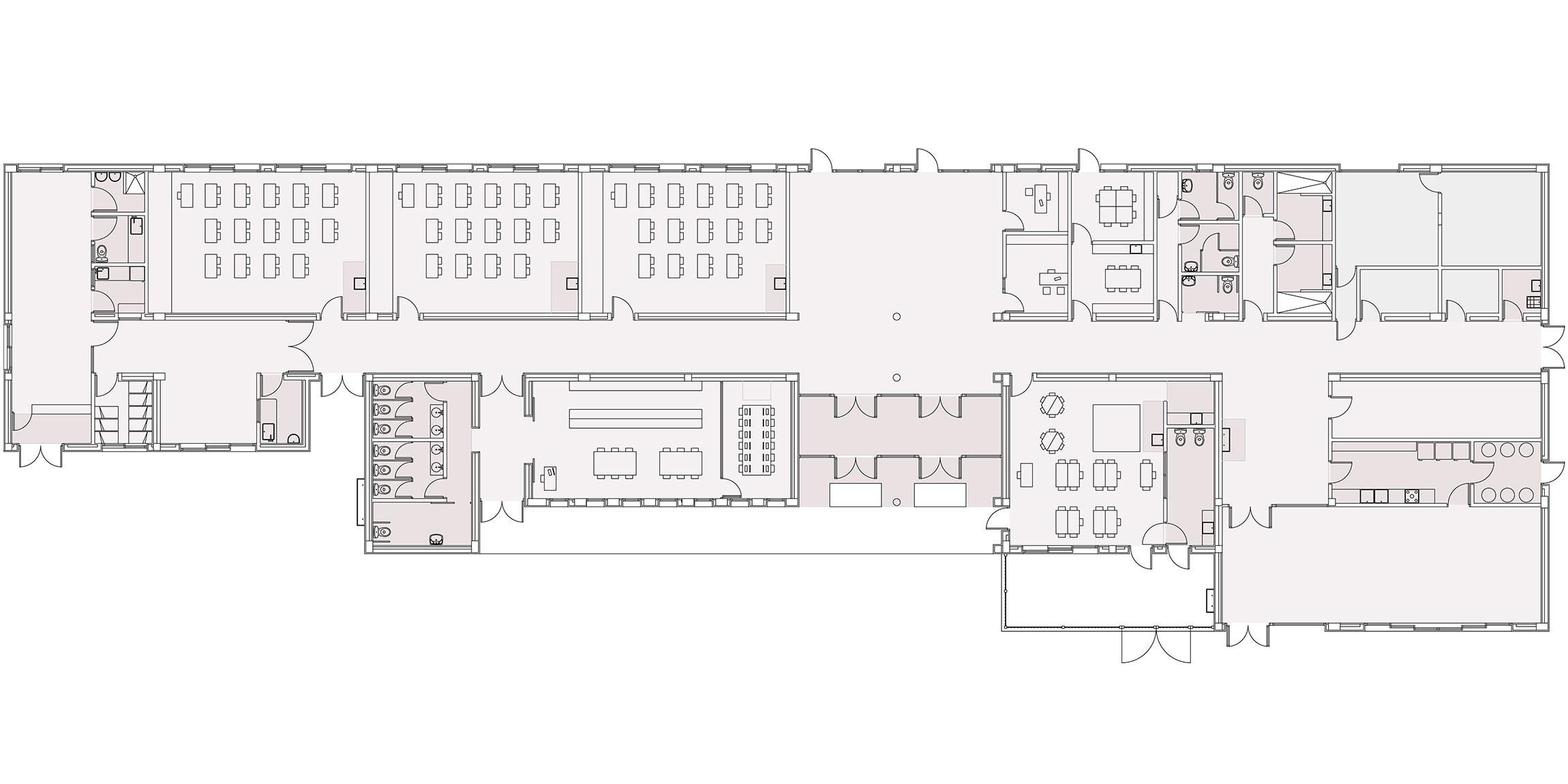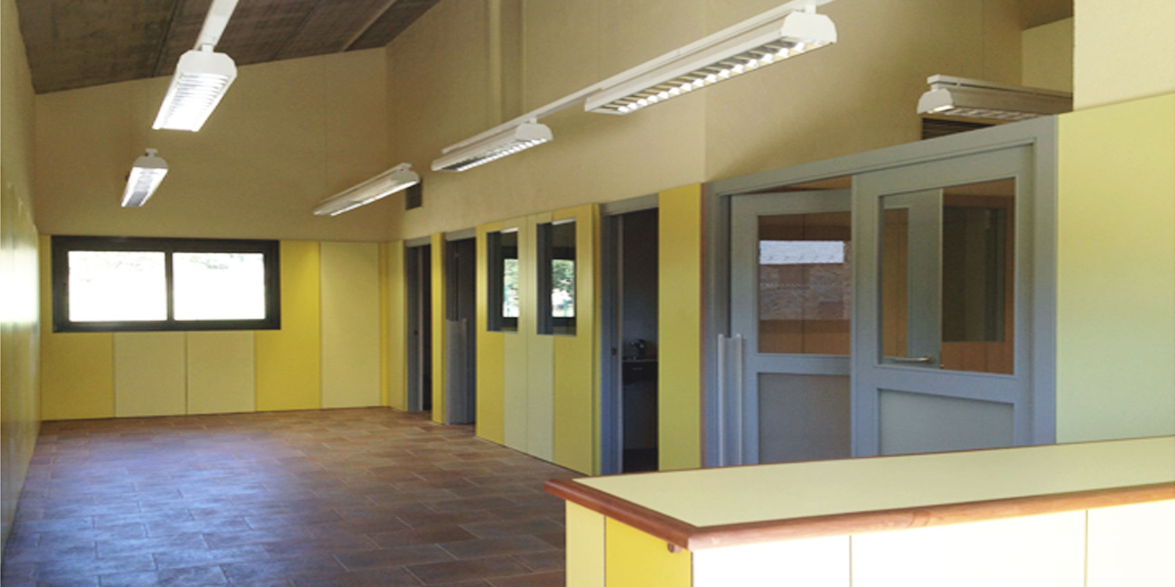 El centro escolar se encuentra en medio de un campo de trigo. La entrada principal está unida a la entrada de la biblioteca pública bajo el cobijo de un porche abierto a los jardines. A continuación, el gran vestíbulo recibe a los niños que corren por pasillos multicolor hacia sus aulas. La importancia de los colores está presente en todas las partes del proyecto, en el exterior por la vegetación, y en el interior a través de les paredes de colores.