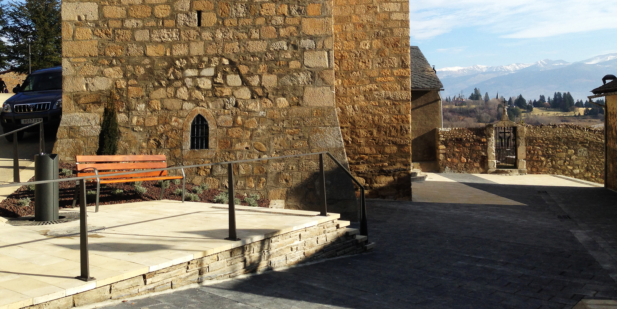 La reordenación de la plaza de la iglesia de Bolvir nace con la voluntad de crear superficies planas para los usuarios. Tanto en la entrada de la iglesia como en el punto del nuevo mirador, las superficies planas conviven con la pendiente que la plaza debe salvar.